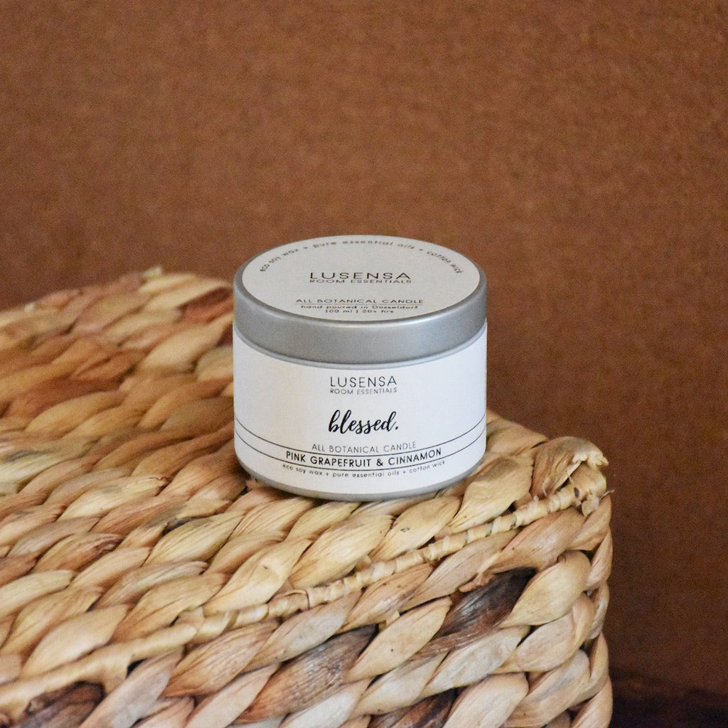 Mit BLESSED Travel holst du dir ein wundervollen, ausgleichenden Duft mit einer langen Brenndauer von über 20 Stunden nach Hause – oder wohin auch immer du willst. Jede Kerze wird liebevoll von Hand in eine leichte, robuste und wieder verschließbare Aluminiumdose gegossen. Der Deckel mit Schraubverschluss sorgt dafür, dass der einzigartige Geruch, eine Kombination aus naturreinen ätherischen Ölen von frischer Pink Grapefruit und samtig, warmen Zimt nicht verloren.
