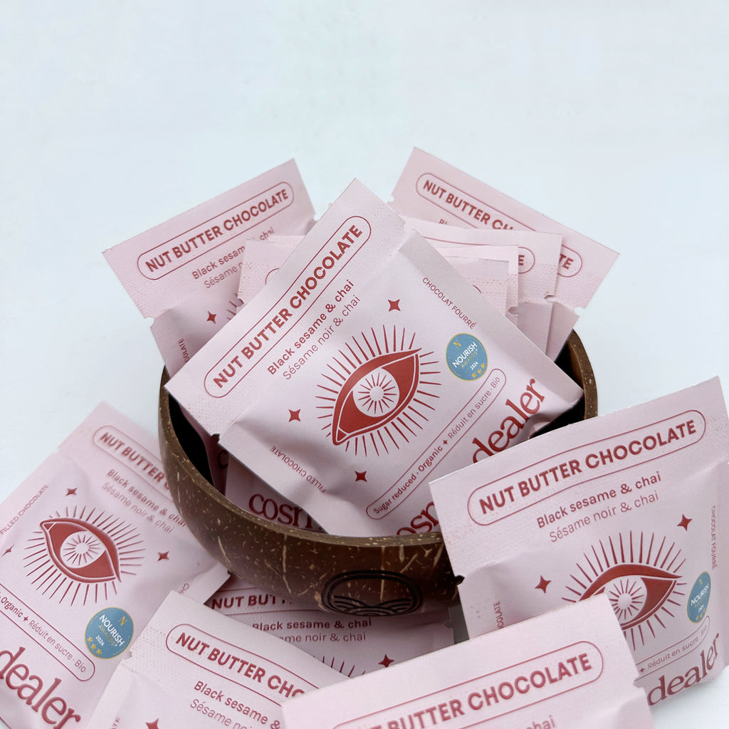 Zutaten: Dunkle Schokolade mit 75 % Kakaogehalt, Dattelzucker, Nussmus (z. B. Cashew, Haselnuss), schwarzer Sesam*, Kardamom*, ayurvedische Gewürze, Salz